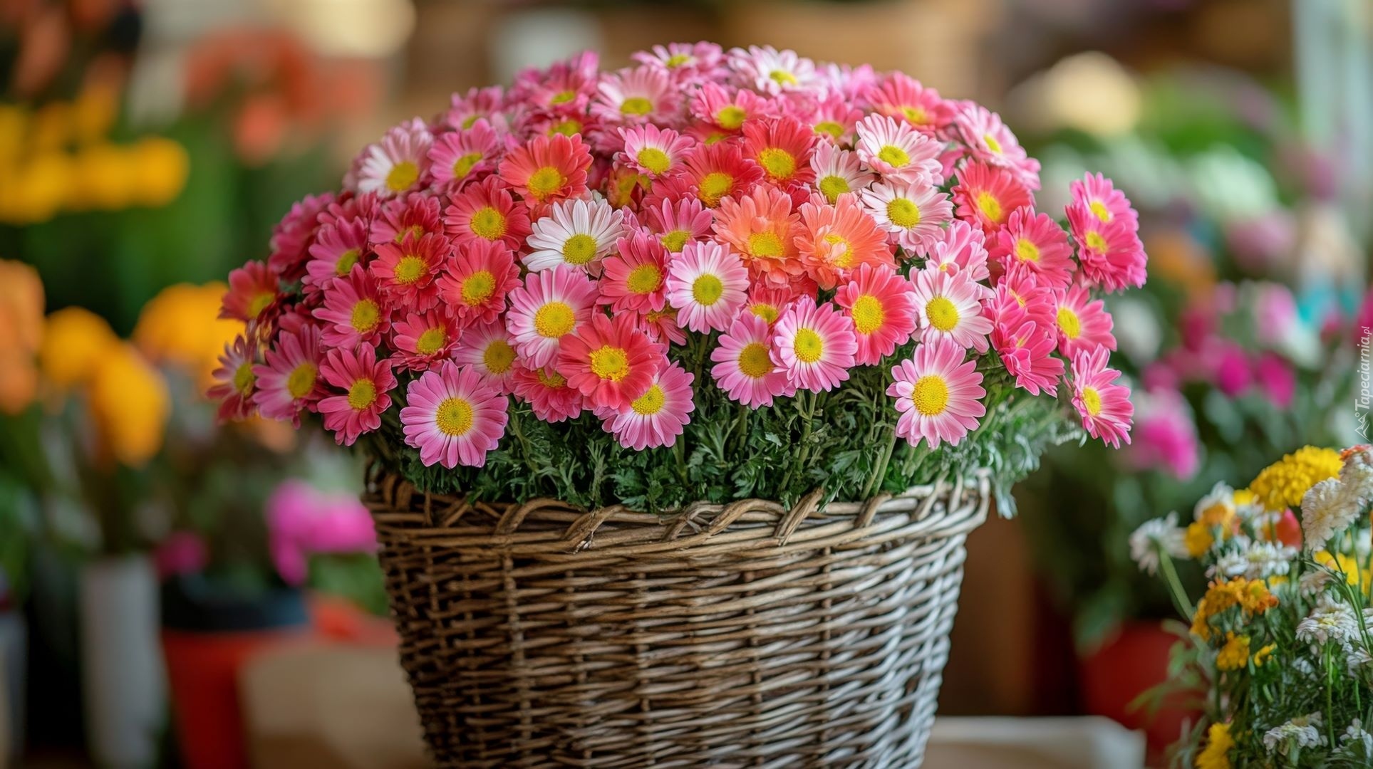 Edytor tapety: Różowe kwiaty w wiklinowym koszyku