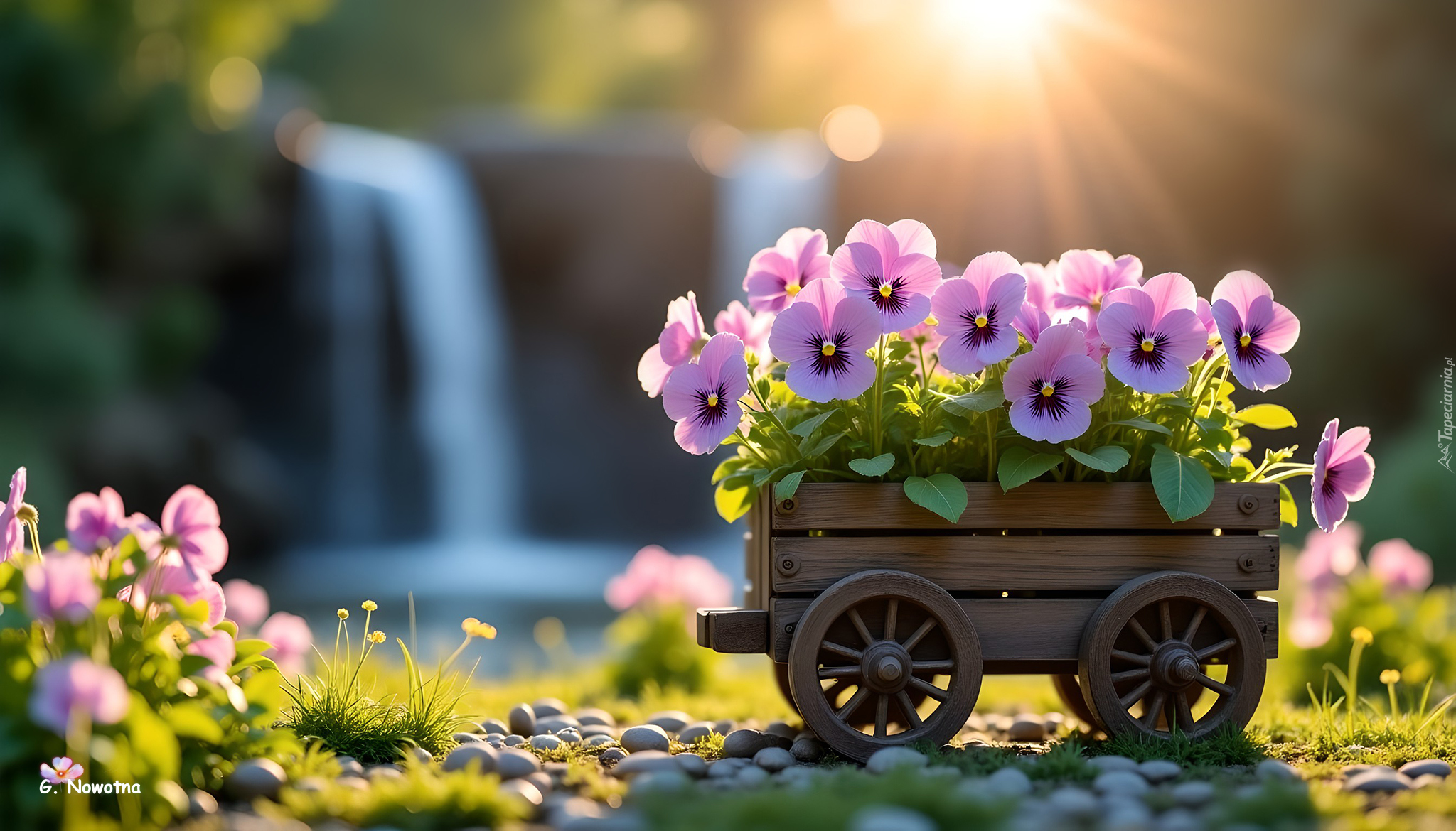 Edytor tapety: Drewniany wózek z różowymi bratkami w promieniach słońca