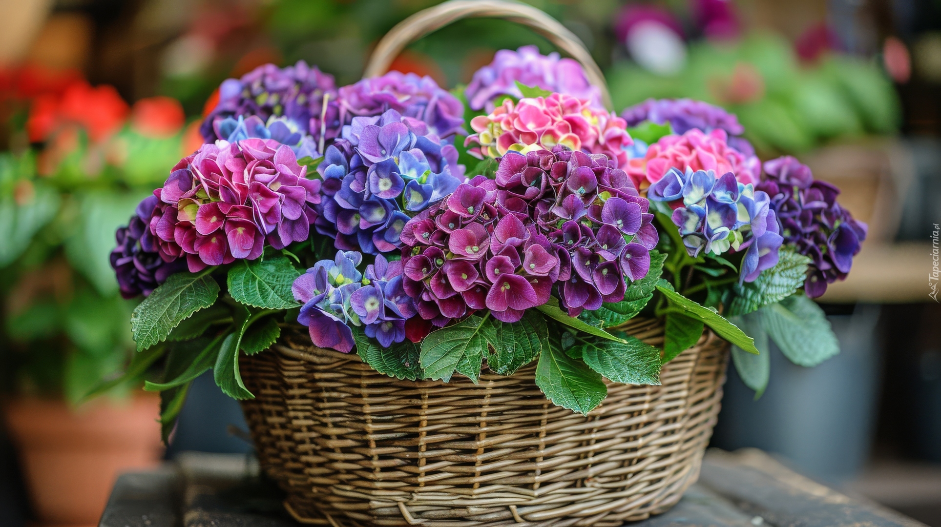 Edytor tapety: Kolorowe hortensje w koszyku