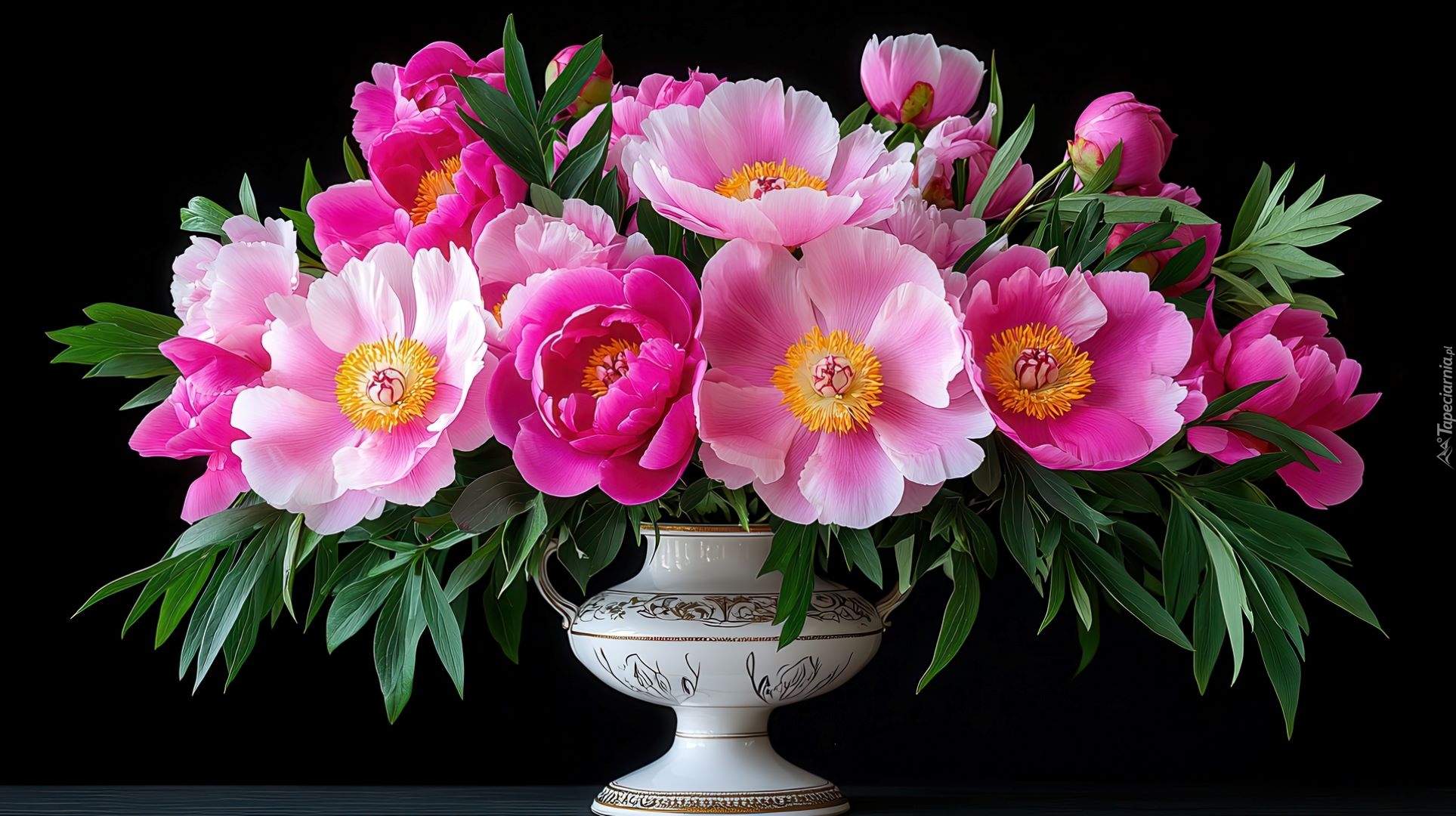 Edytor tapety: Rozkwitnięte różowe piwonie w wazie