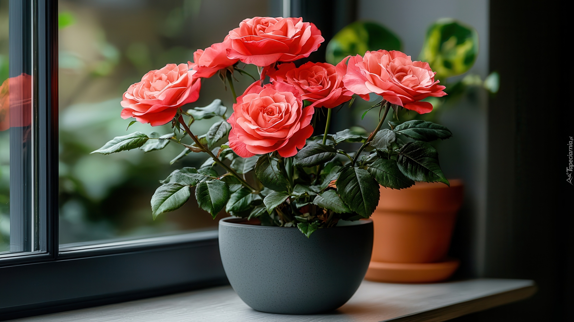 Edytor tapety: Czerwone róże w szarej doniczce na okiennym parapecie