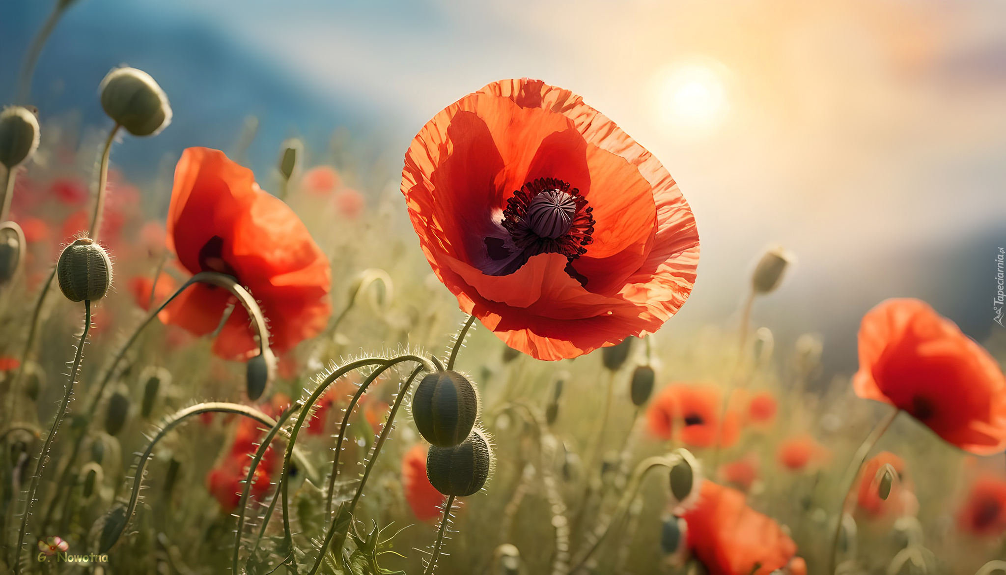 Edytor tapety: Czerwone maki i pąki w słonecznym blasku