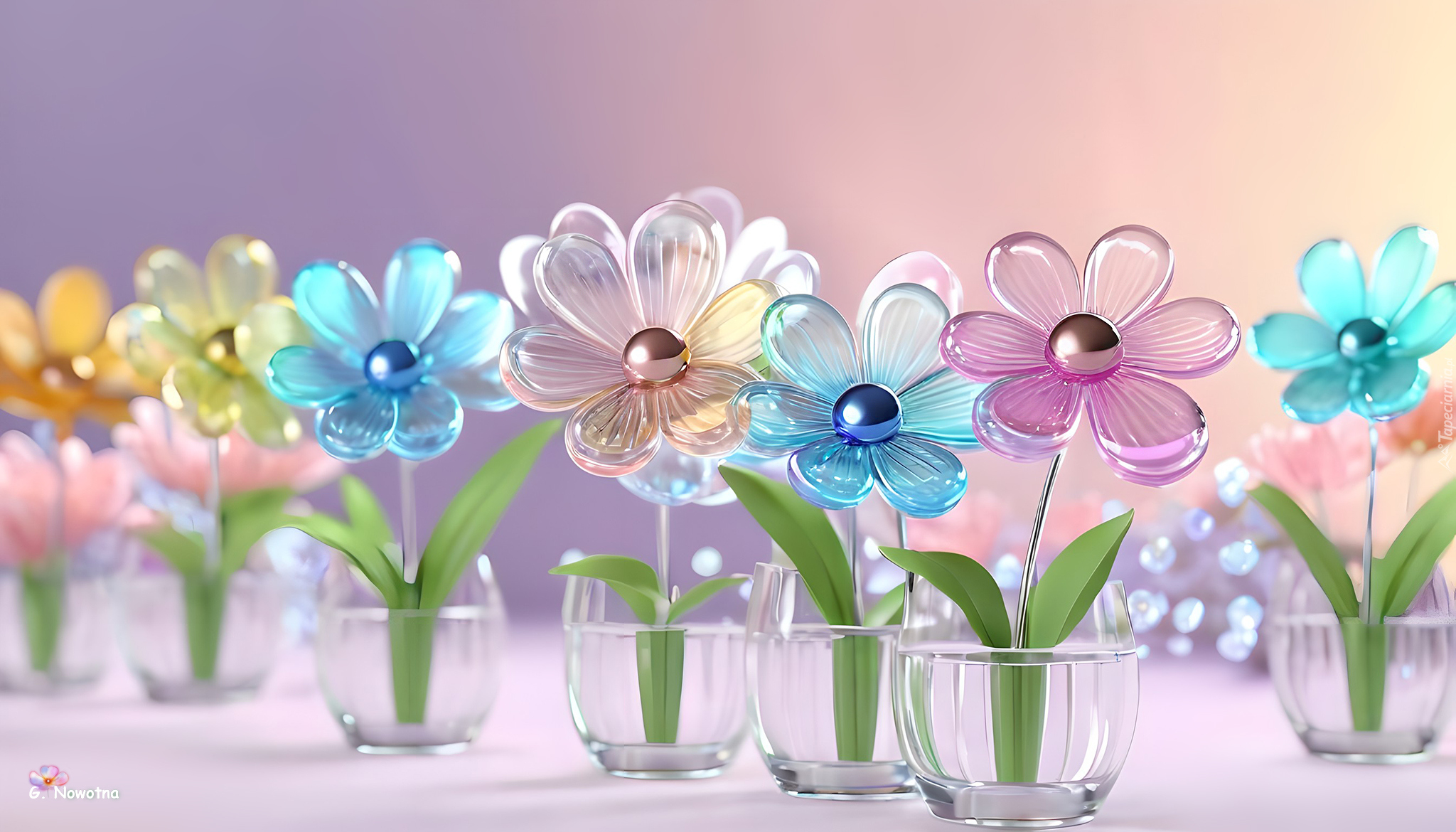 Edytor tapety: Kolorowe szklane kwiaty w małych szklanych naczyniach