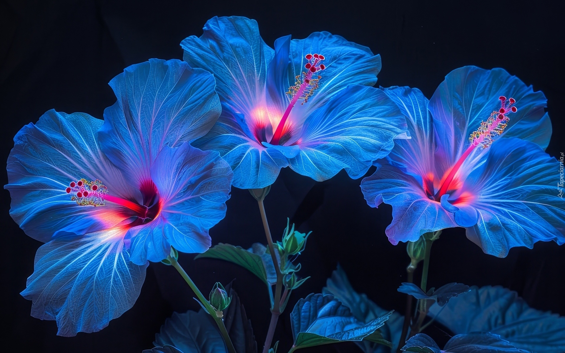 Edytor tapety: Trzy rozkwitnięte niebieskie kwiaty hibiskusa