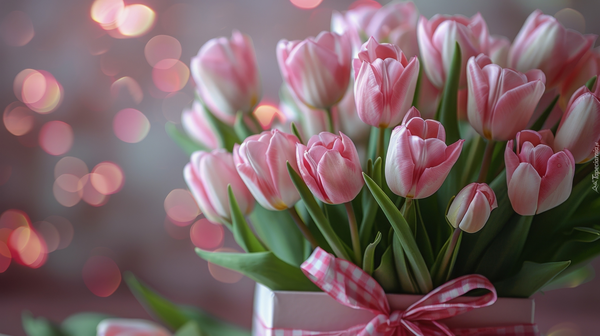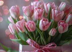 Edytor tapety: Jasnoróżowe tulipany w pudełku z kokardą