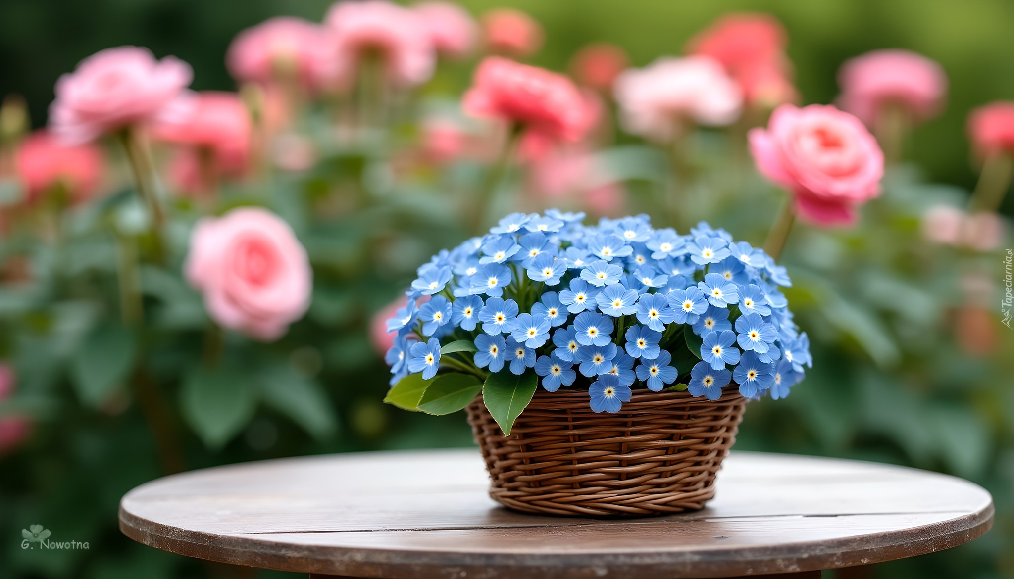 Edytor tapety: Wiklinowy koszyk z niebieskimi kwiatami na okrągłym stoliku