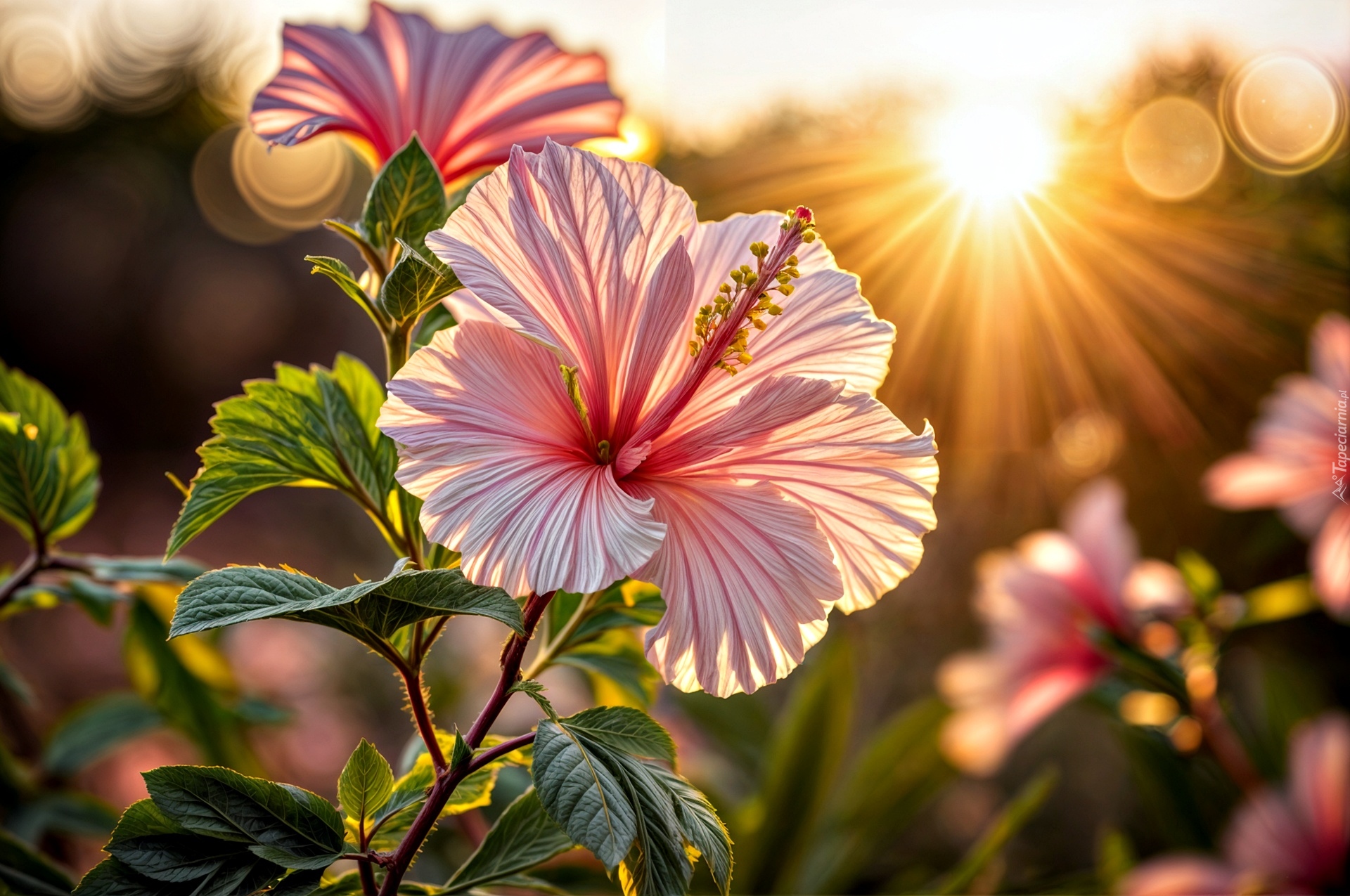 Edytor tapety: Rozświetlony promieniami słońca jasnoróżowy kwiat hibiskusa