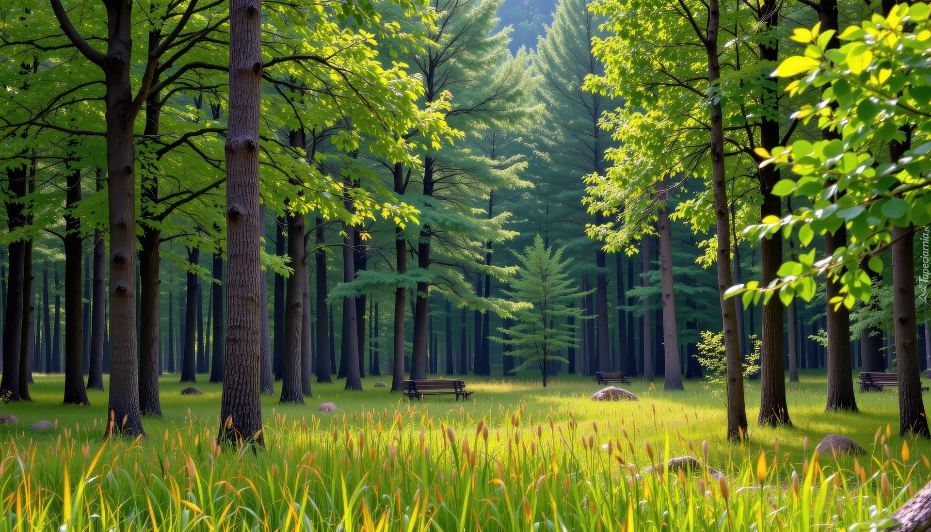 Edytor tapety: Ławka wśród drzew w zielonym lesie