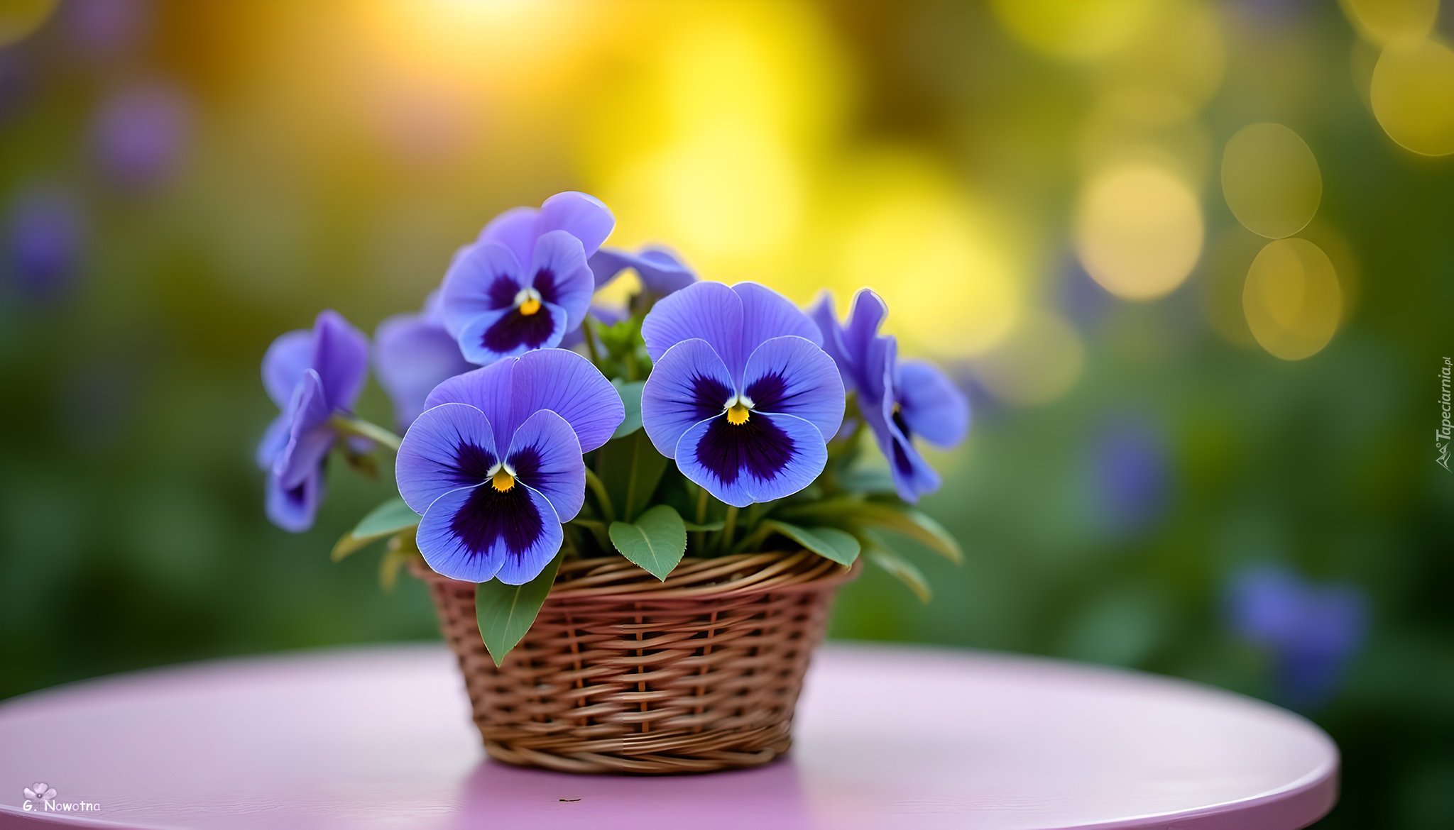 Edytor tapety: Koszyczek z niebieskimi bratkami na okrągłym stole