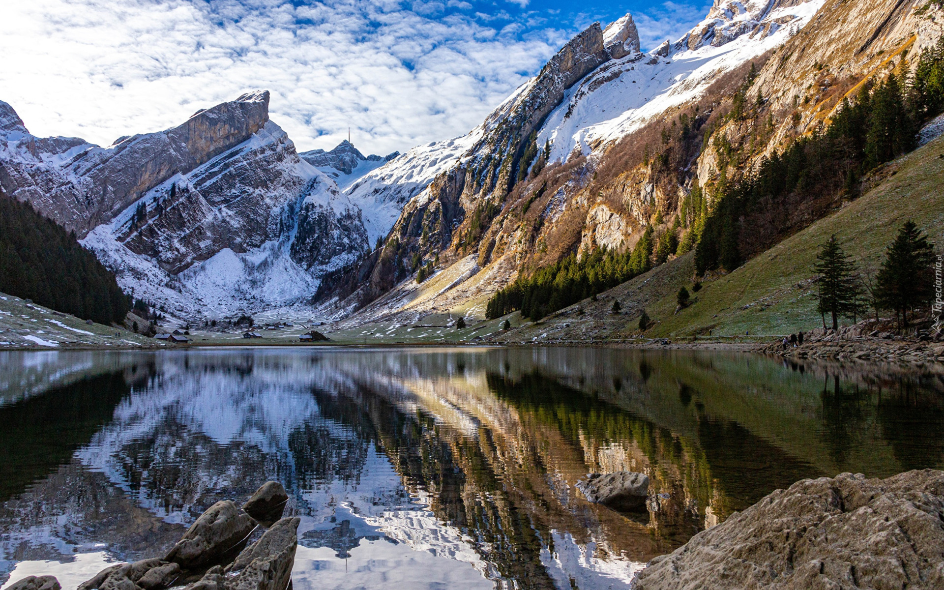 Edytor tapety: Jezioro i drzewa u podnóża ośnieżonych gór