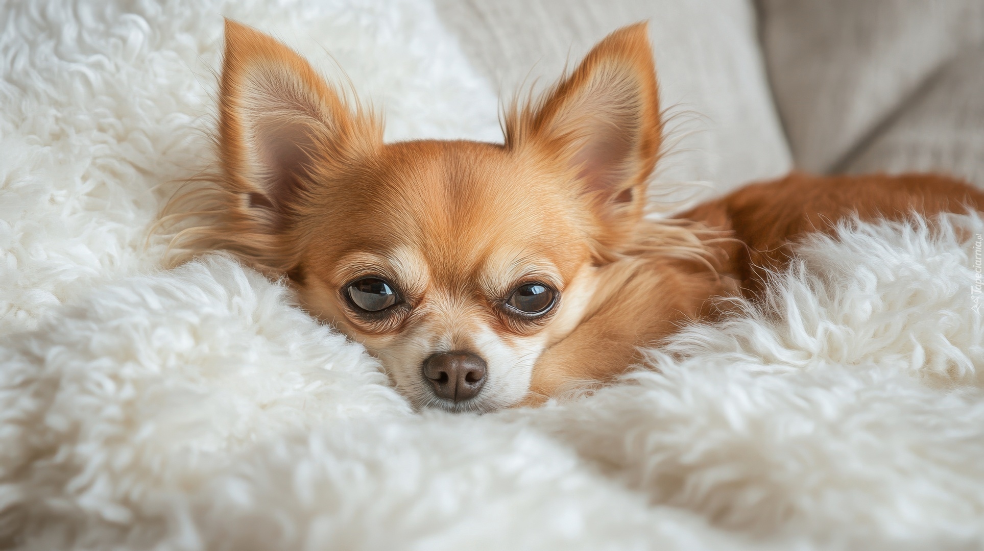 Edytor tapety: Jasnobrązowa chihuahua na posłaniu
