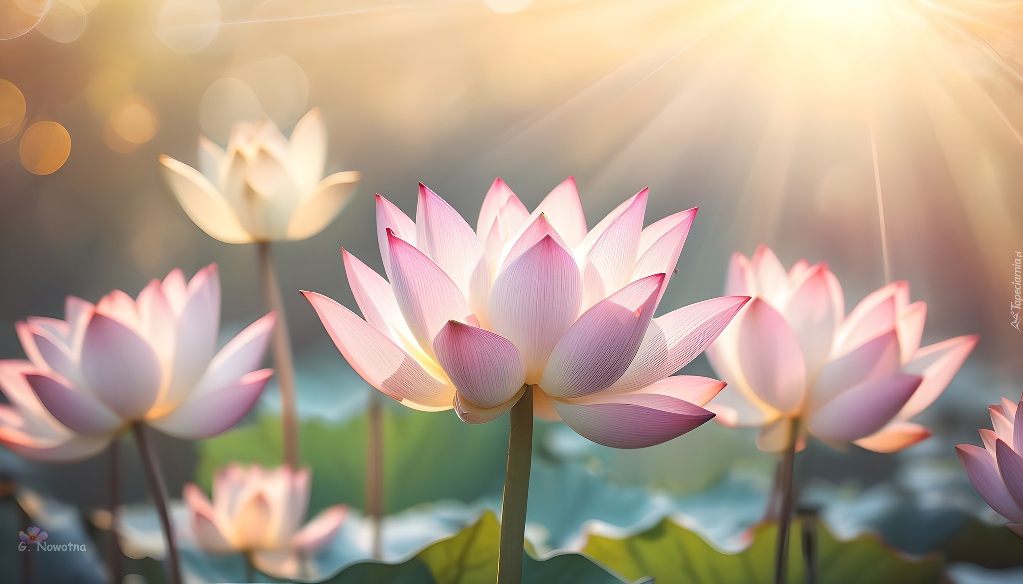 Edytor tapety: Rozświetlone promieniami słońca jasnoróżowe lotosy