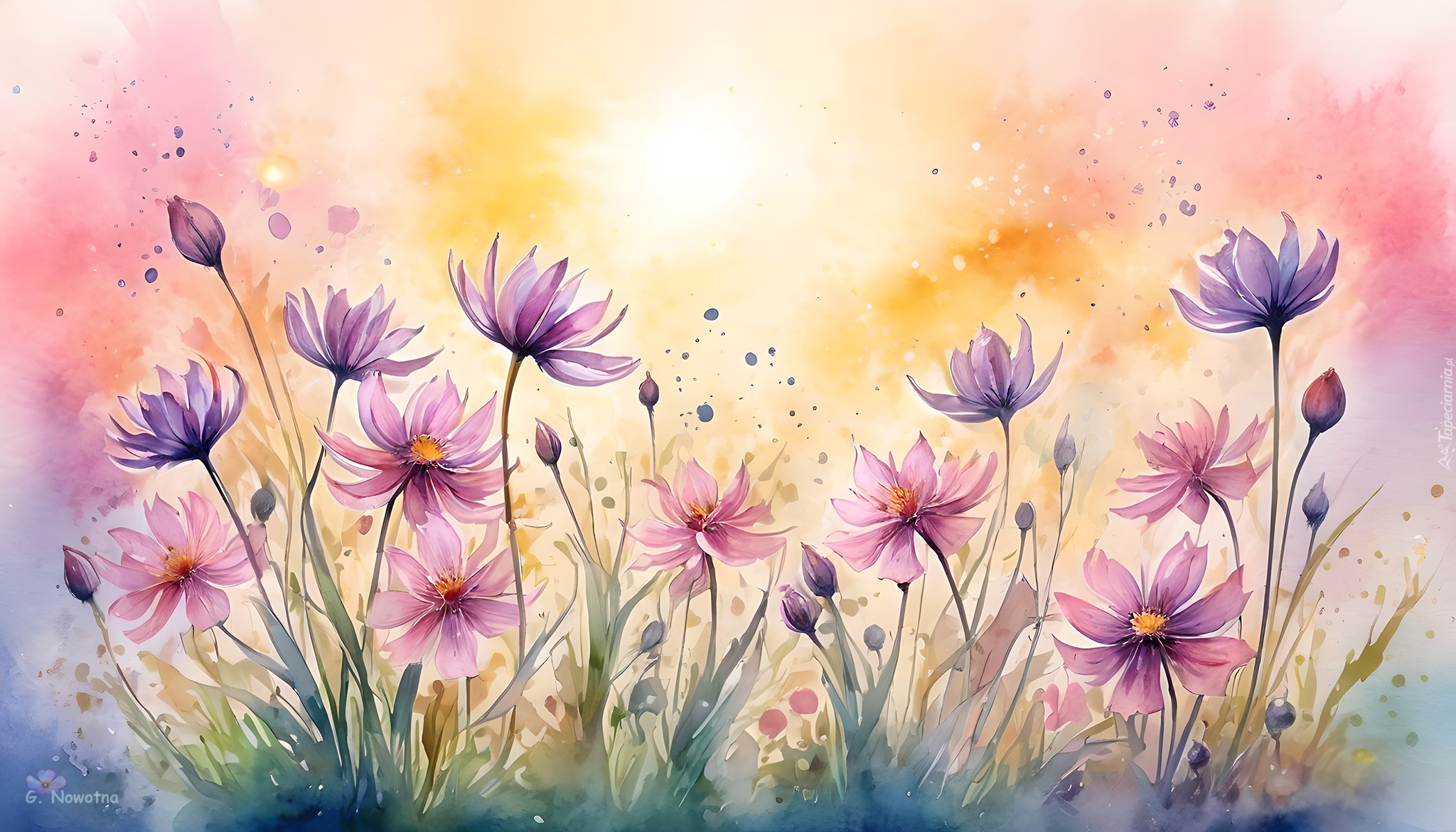 Edytor tapety: Fioletowe i różowe kwiaty na rozświetlonym tle