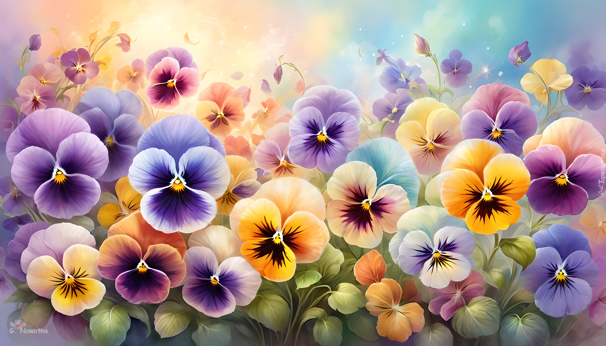 Edytor tapety: Rozkwitnięte kolorowe bratki w grafice