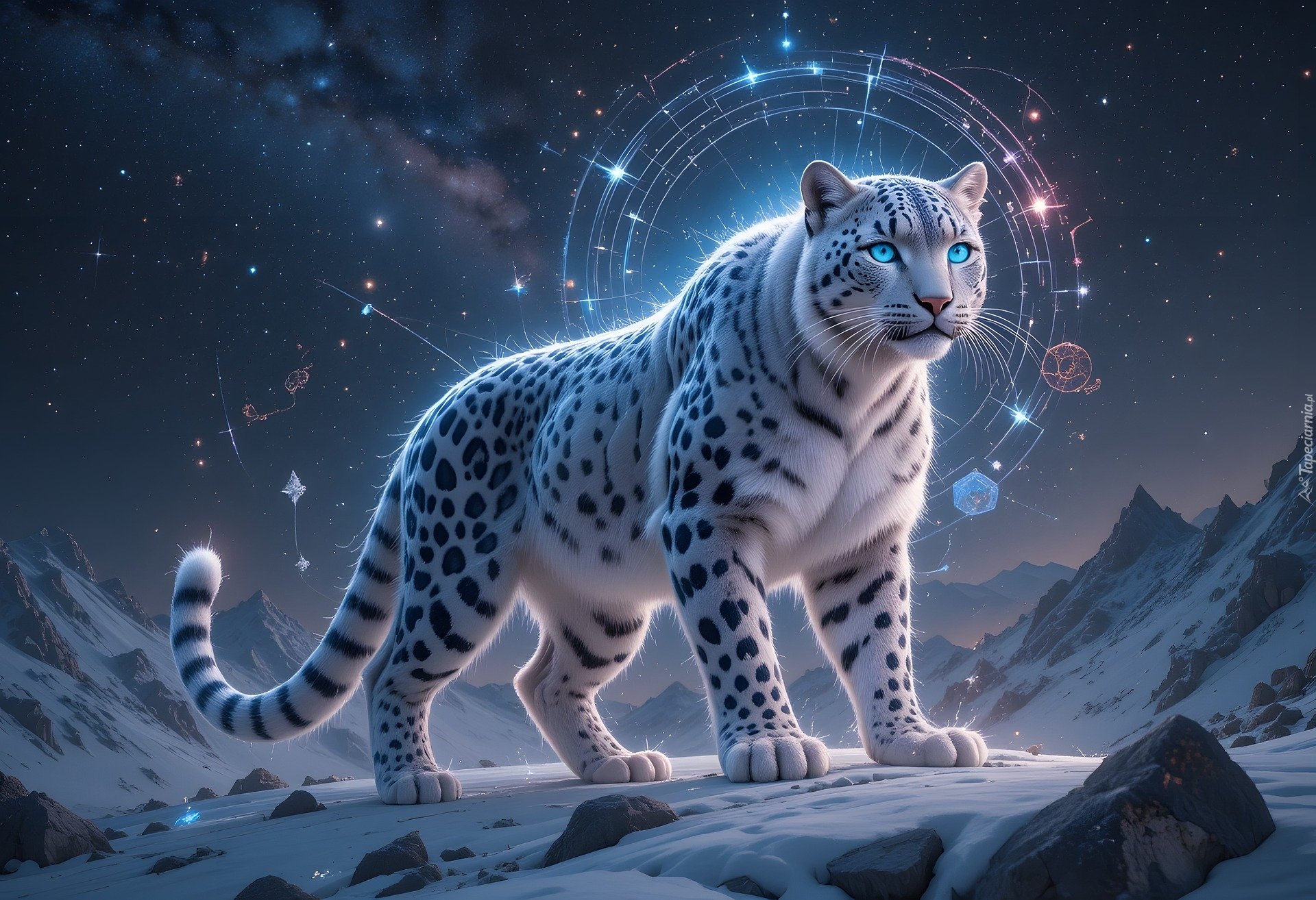 Edytor tapety: Grafika z białym lampartem na tle ośnieżonych gór