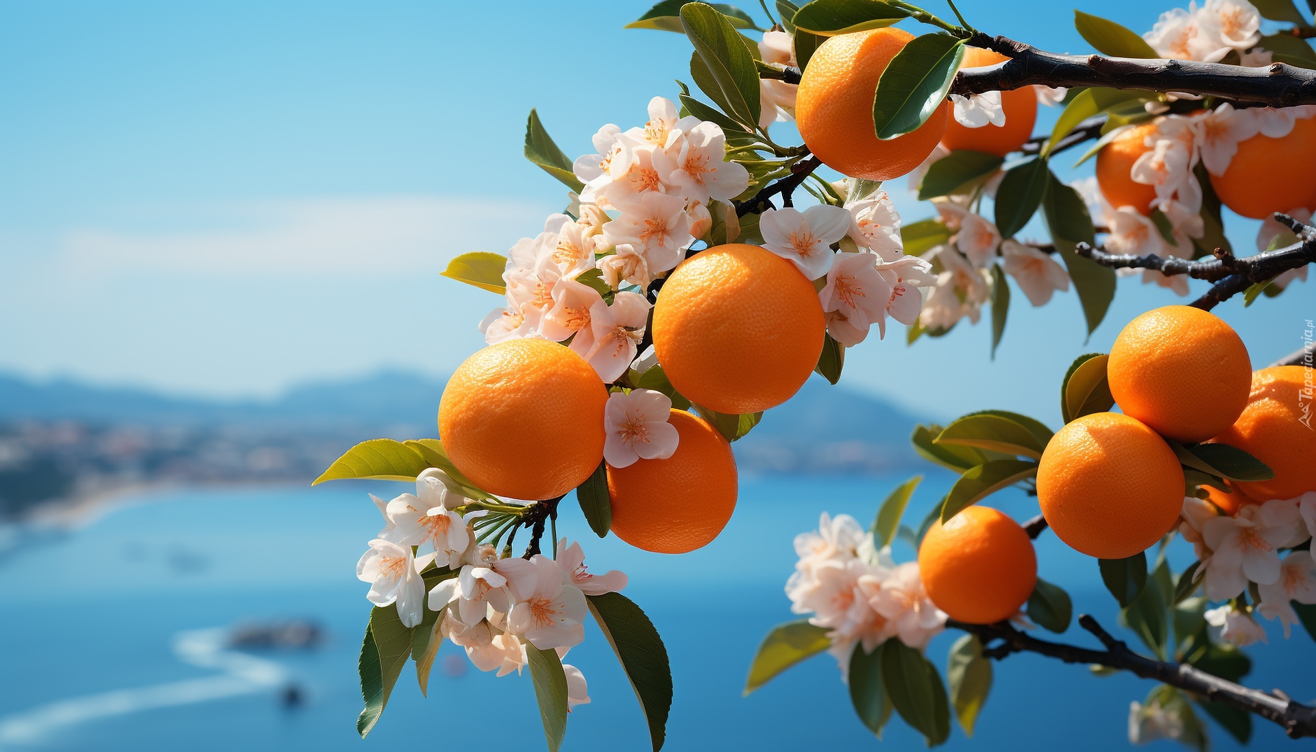 Edytor tapety: Pomarańcze i kwiaty na gałązkach drzewa owocowego