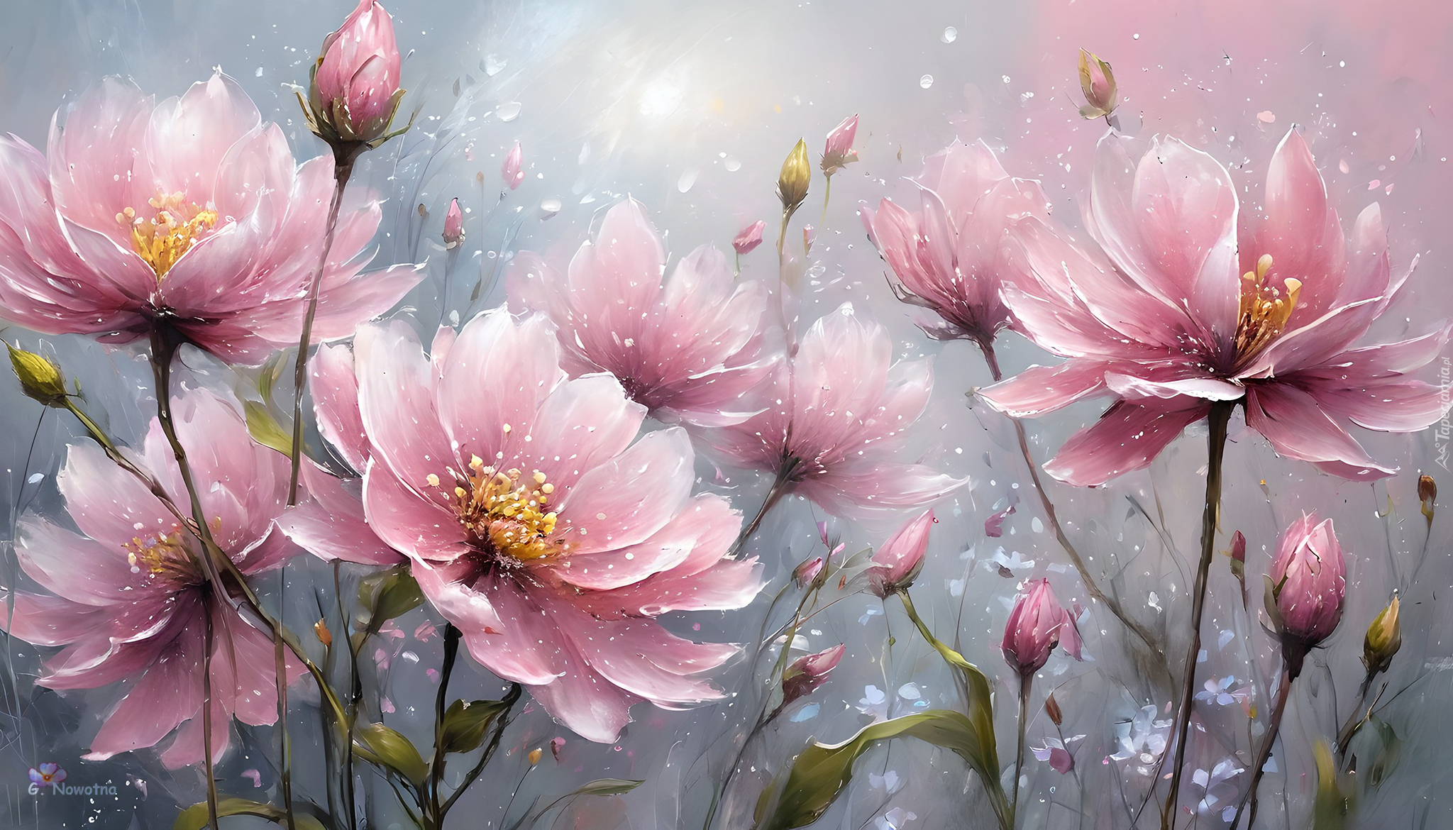 Edytor tapety: Rozwinięte różowe kwiaty z pąkami w grafice