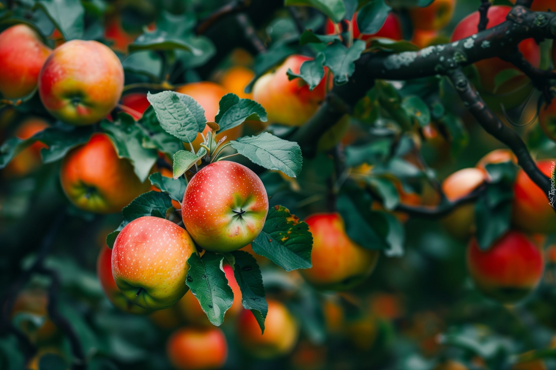 Edytor tapety: Jabłka i liście na drzewie owocowym
