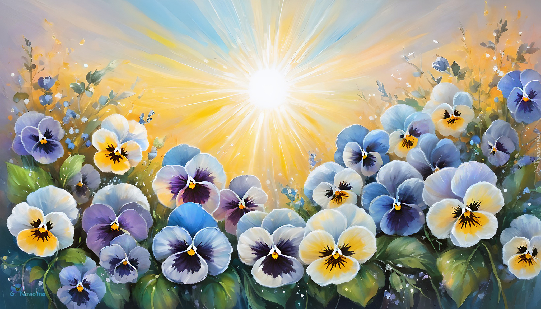 Edytor tapety: Żółte i niebieskie bratki w słonecznych promieniach