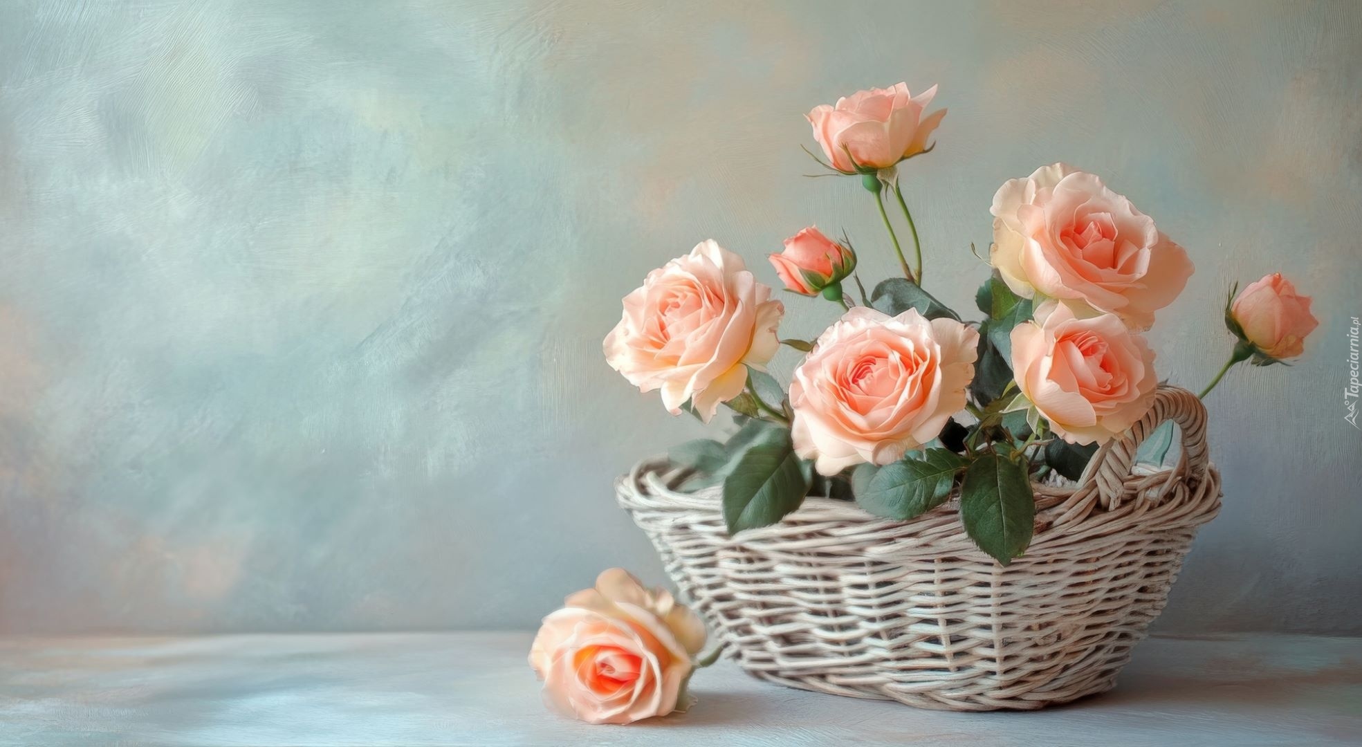 Edytor tapety: Biały wiklinowy koszyk z różowymi różami
