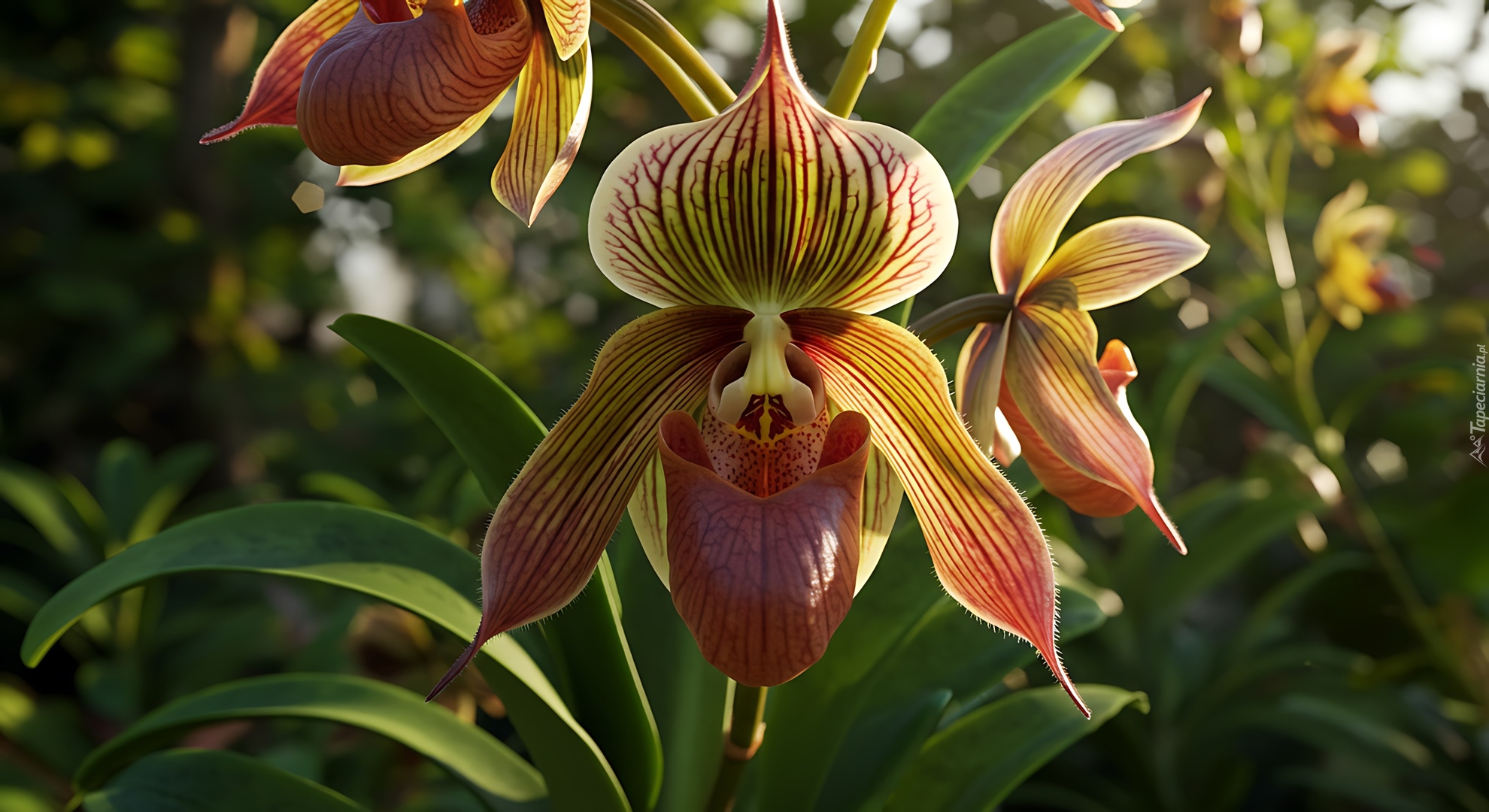 Edytor tapety: Rozświetlony storczyk sabotek z liśćmi