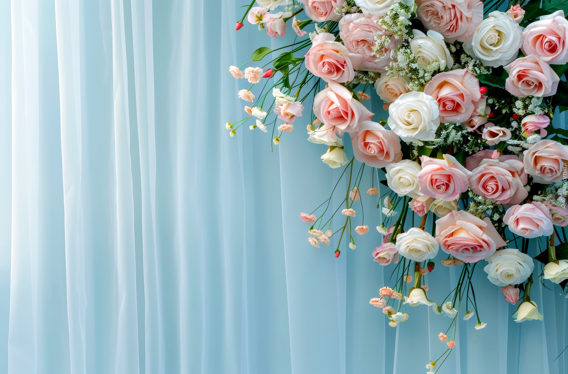Edytor tapety: Bukiet kolorowych róż na niebieskiej tkaninie