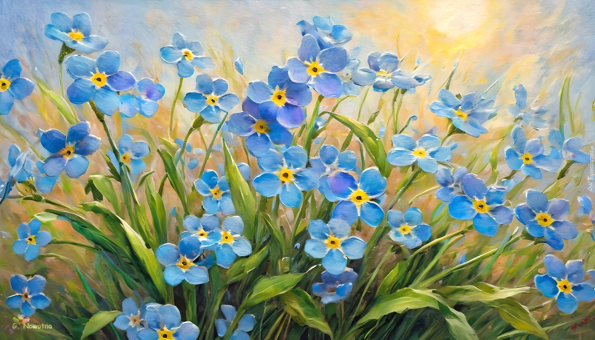Edytor tapety: Grafika z niebieskimi niezapominajkami na tle słońca
