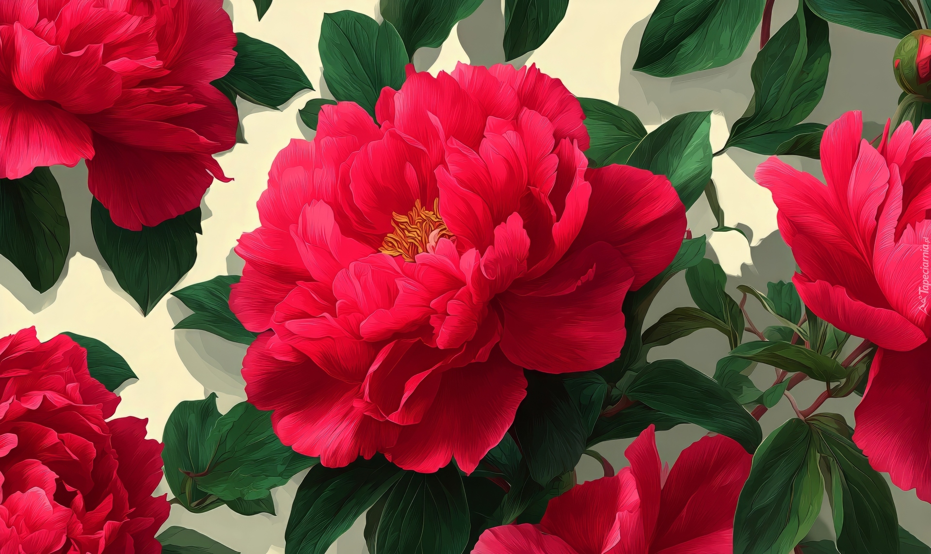 Edytor tapety: Czerwone piwonie i liście na jasnym tle