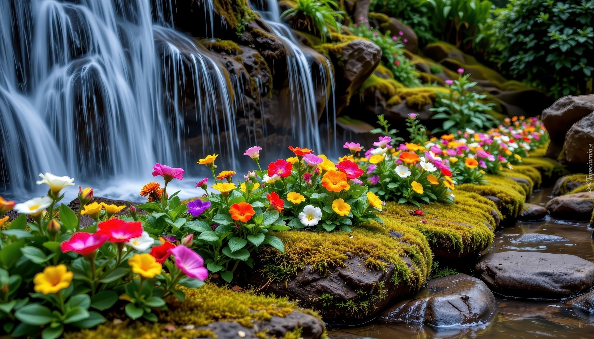 Edytor tapety: Kolorowe kwiaty i omszałe kamienie przy wodospadzie