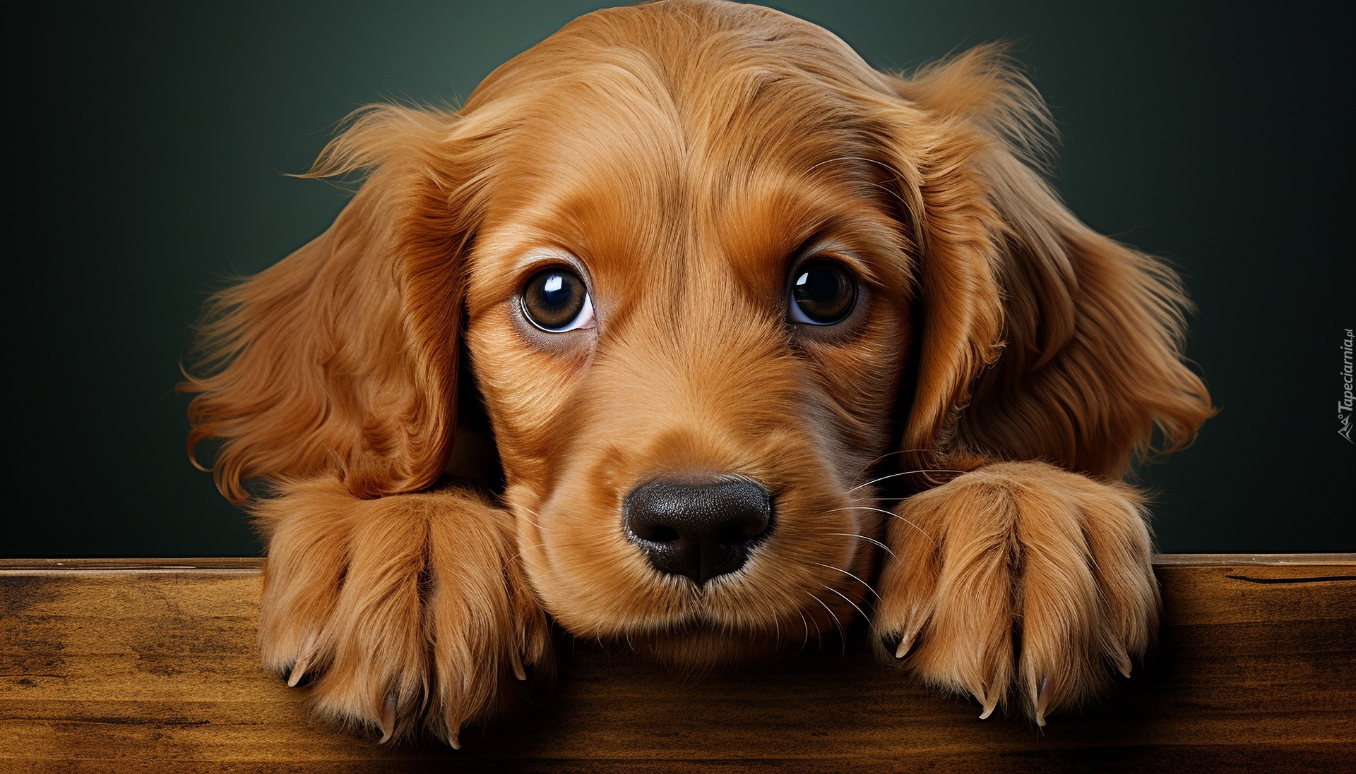 Edytor tapety: Brązowy szczeniak oparty łapkami i mordką o deskę