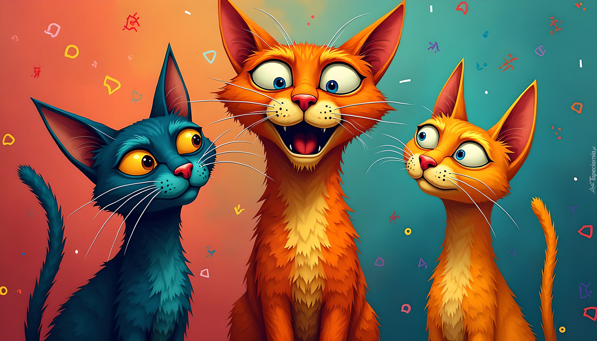 Edytor tapety: Trzy koty na kolorowym tle w grafice