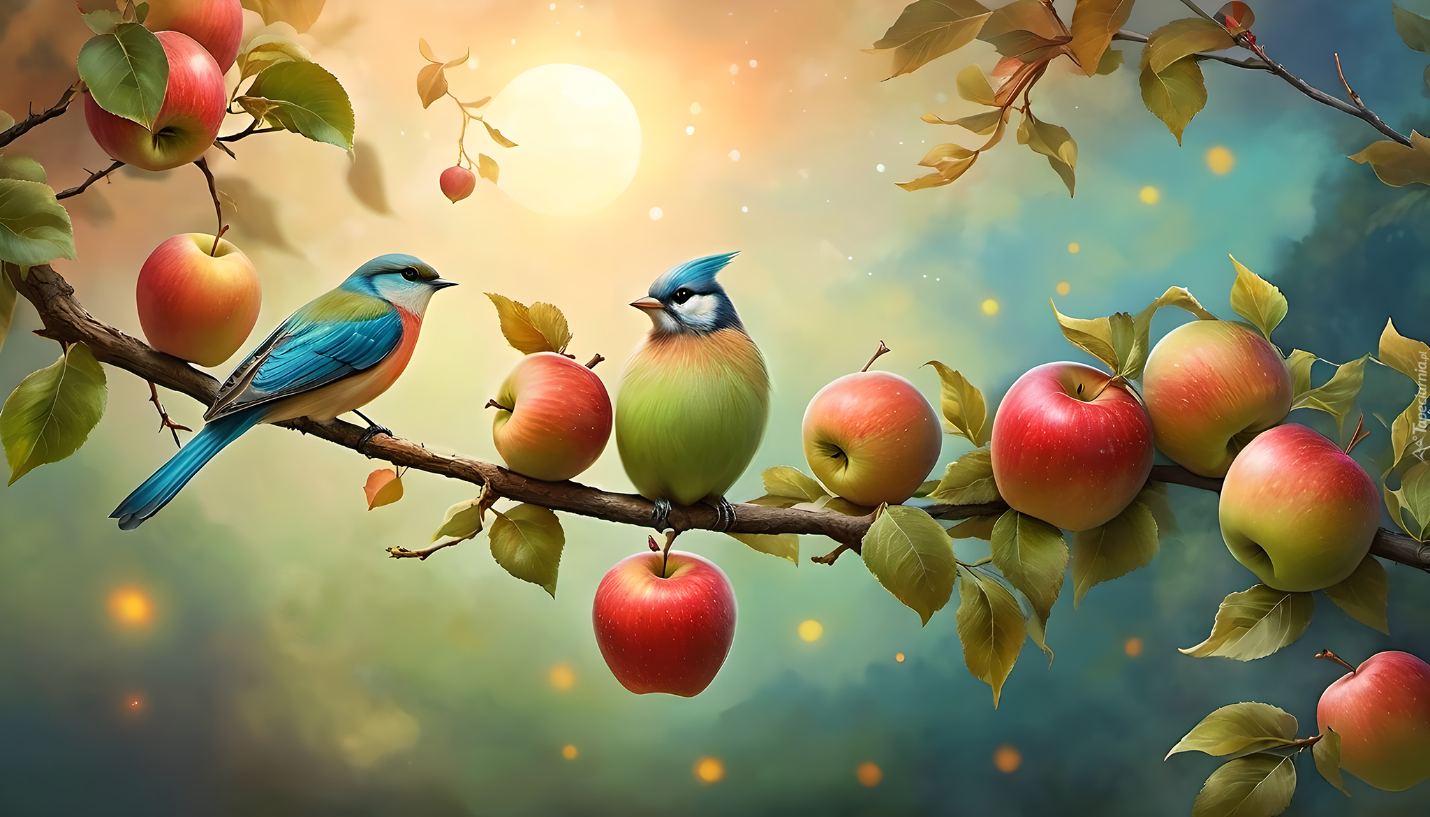 Edytor tapety: Dwa kolorowe ptaki na gałązce z jabłkami