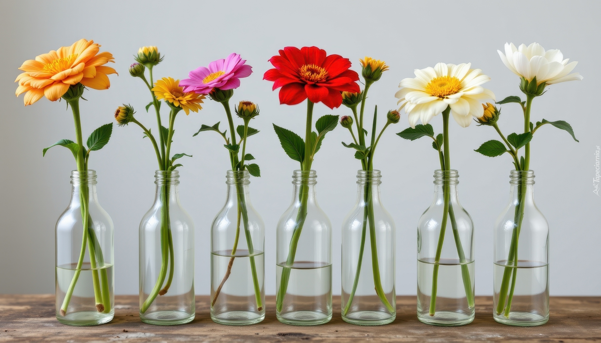 Edytor tapety: Kolorowe kwiaty w szklanych butelkach