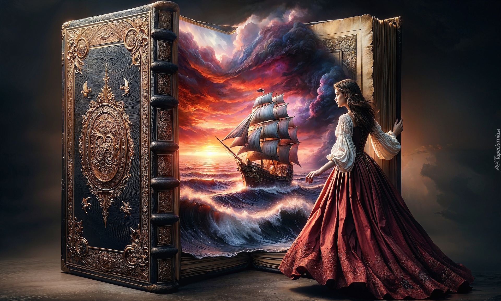 Edytor tapety: Kobieta obok książki i żaglowiec na morzu