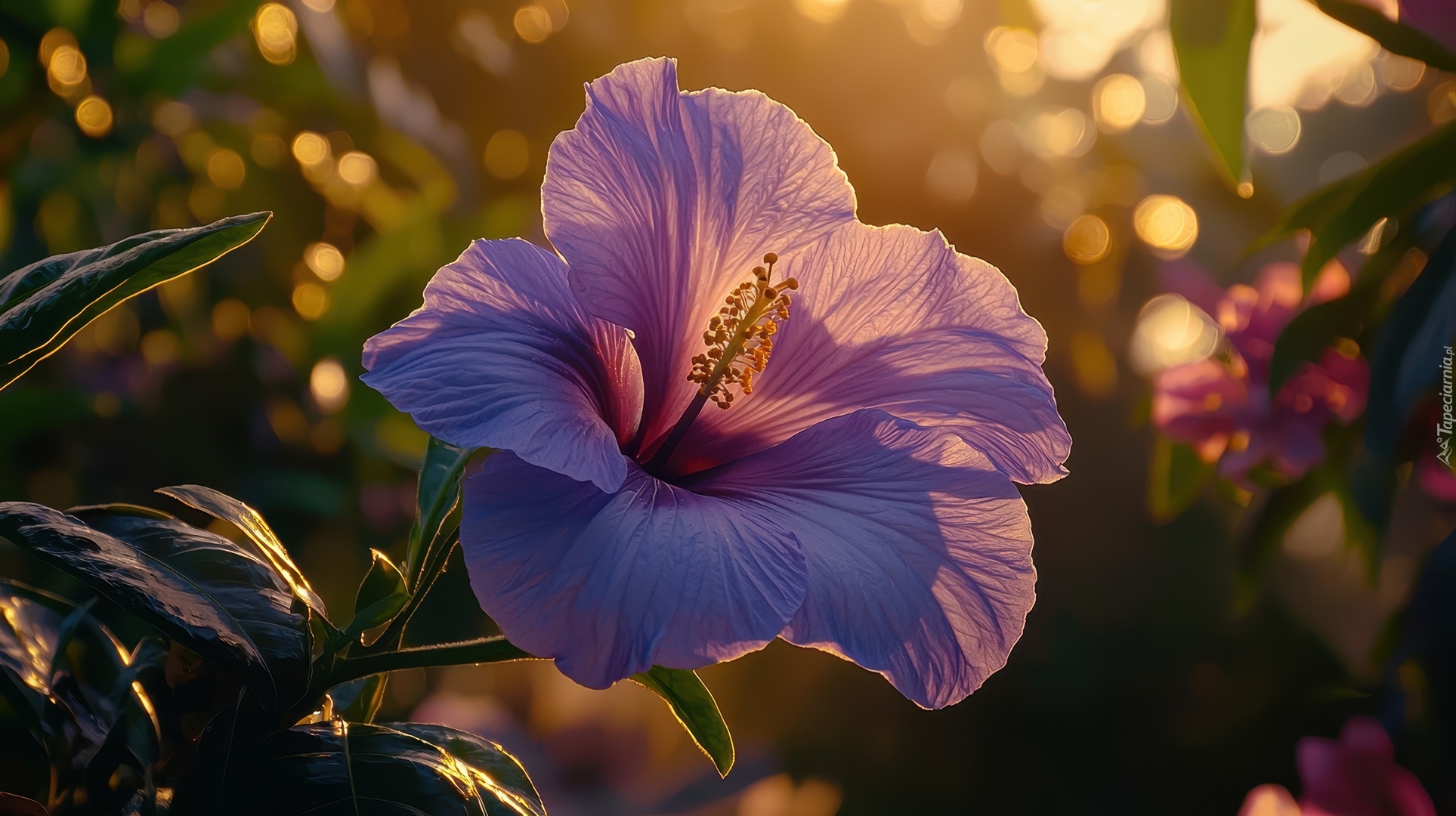 Edytor tapety: Rozświetlony purpurowy kwiat hibiskusa