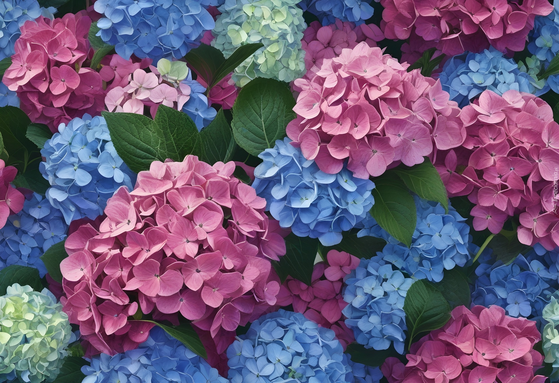 Edytor tapety: Rozwinięte różowe i niebieskie hortensje