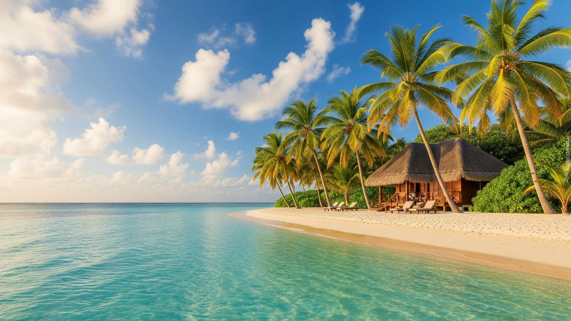 Edytor tapety: Dom pod palmami na morskiej plaży w tropikach