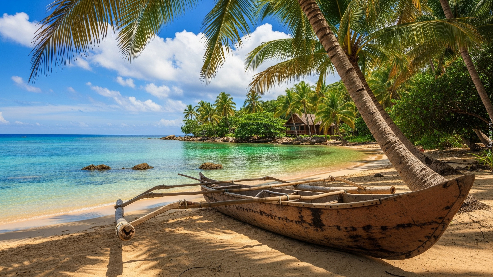 Edytor tapety: Łódka pod palmą na morskiej plaży w tropikach