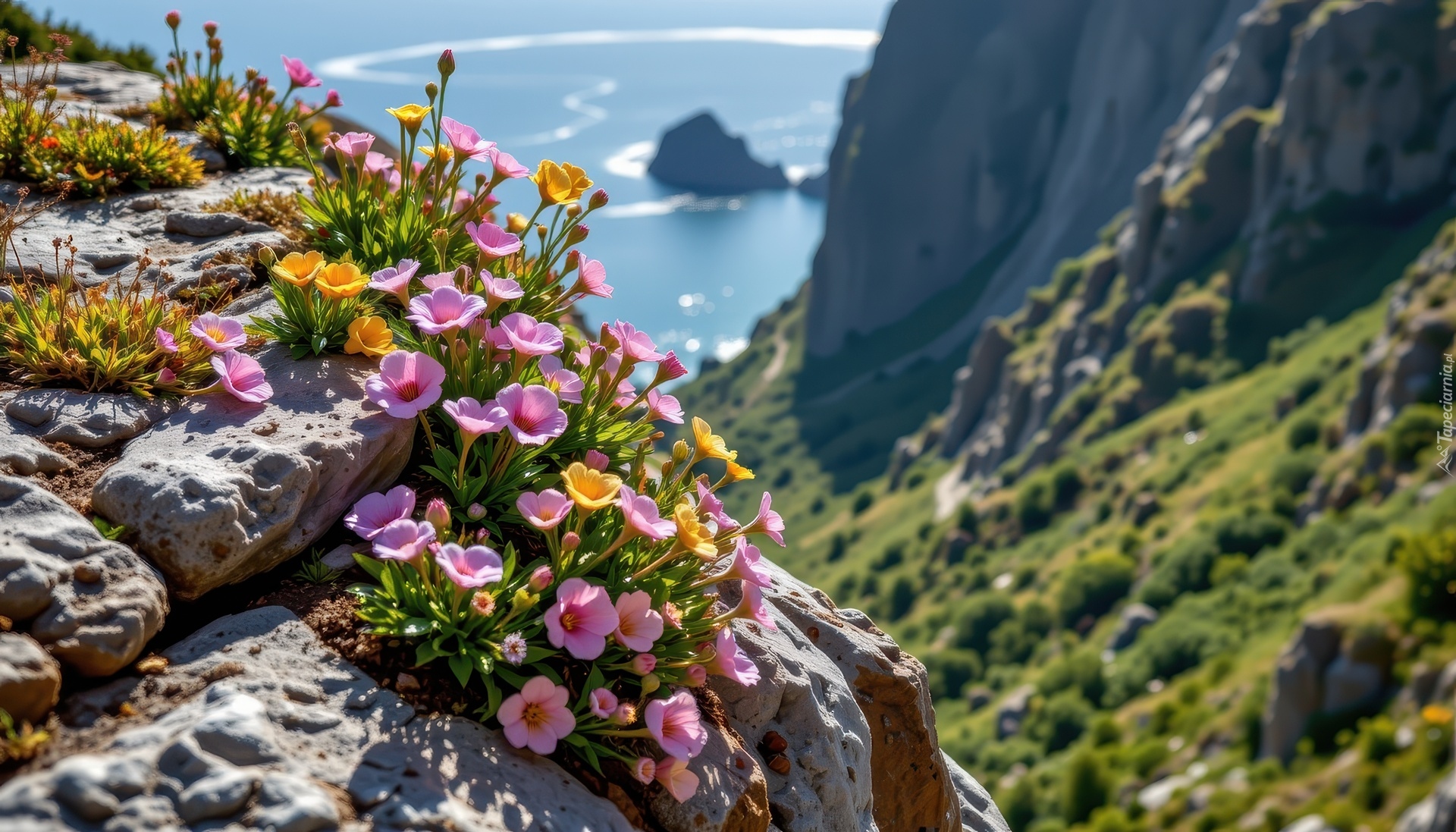 Edytor tapety: Kwiaty na skale z widokiem na morze