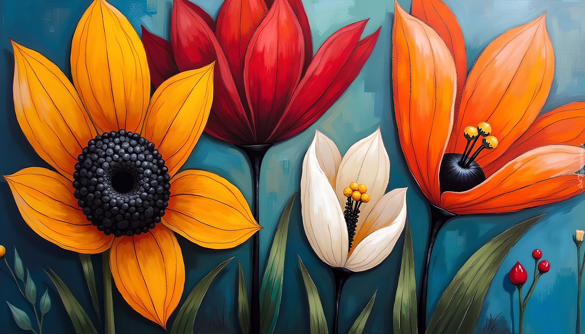 Edytor tapety: Cztery kolorowe kwiaty na niebieskim tle w grafice