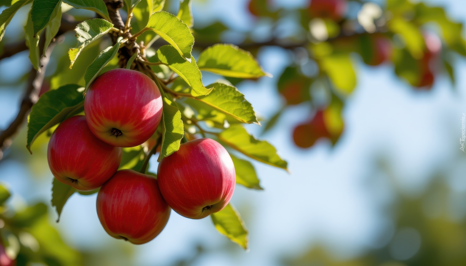 Edytor tapety: Cztery czerwone jabłka i liście na gałęzi