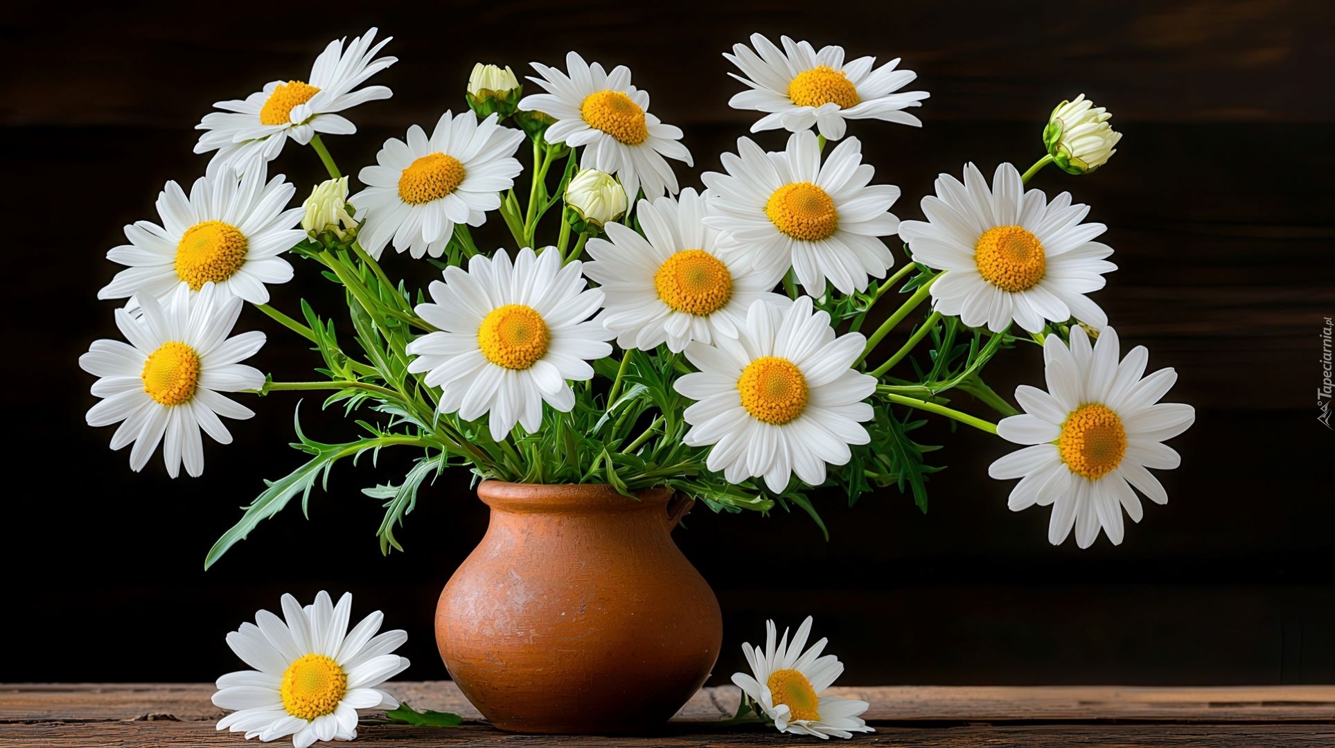 Edytor tapety: Białe margerytki w glinianym wazonie