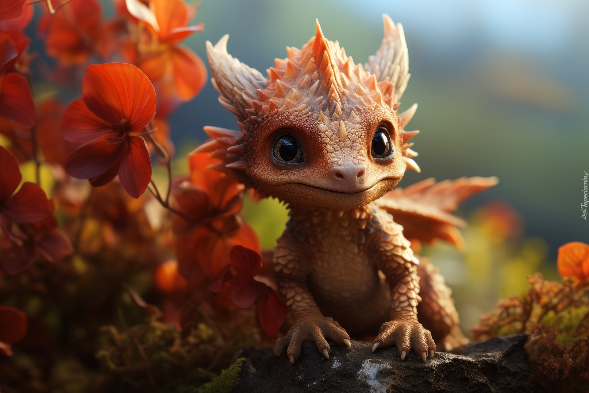 Edytor tapety: Mały smok obok pomarańczowych roślin w grafice