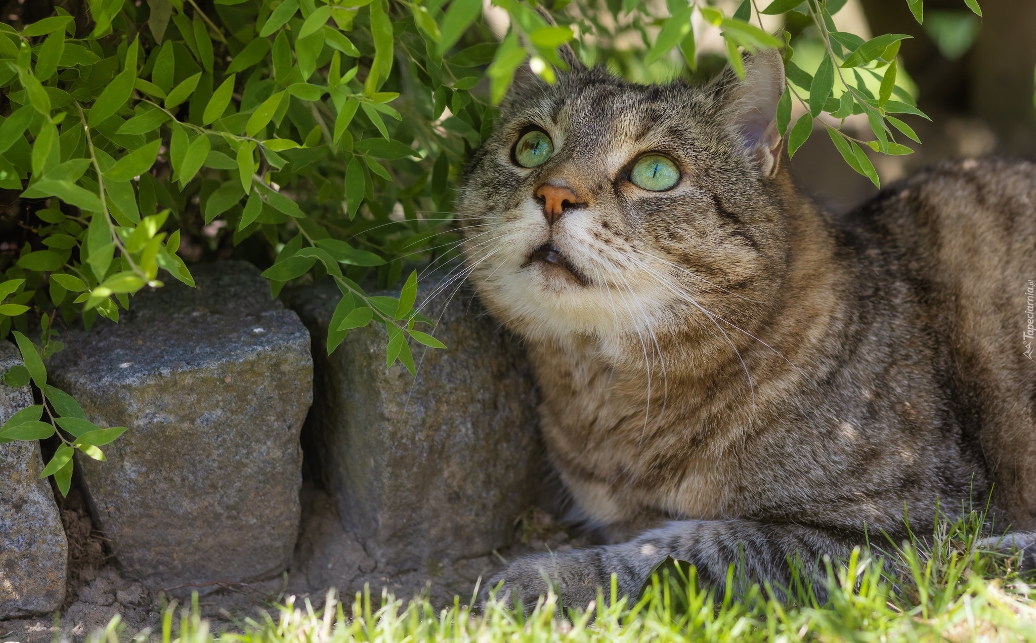 Edytor tapety: Zielonooki bury kot leżący pod gałązkami obok kamieni