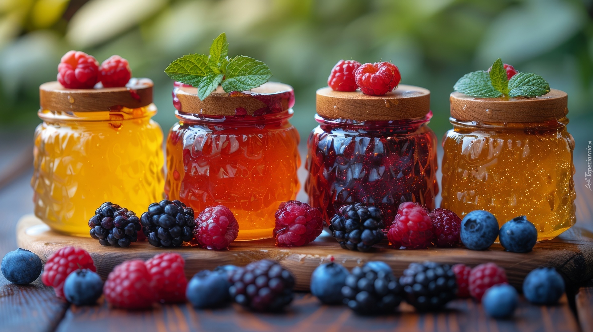 Edytor tapety: Cztery słoiki z dżemami oraz owoce na desce
