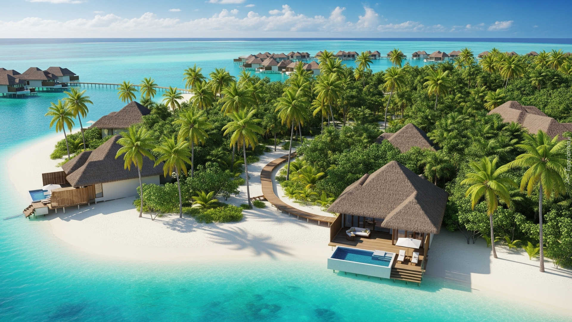 Edytor tapety: Domy wśród palm na plaży w tropikach