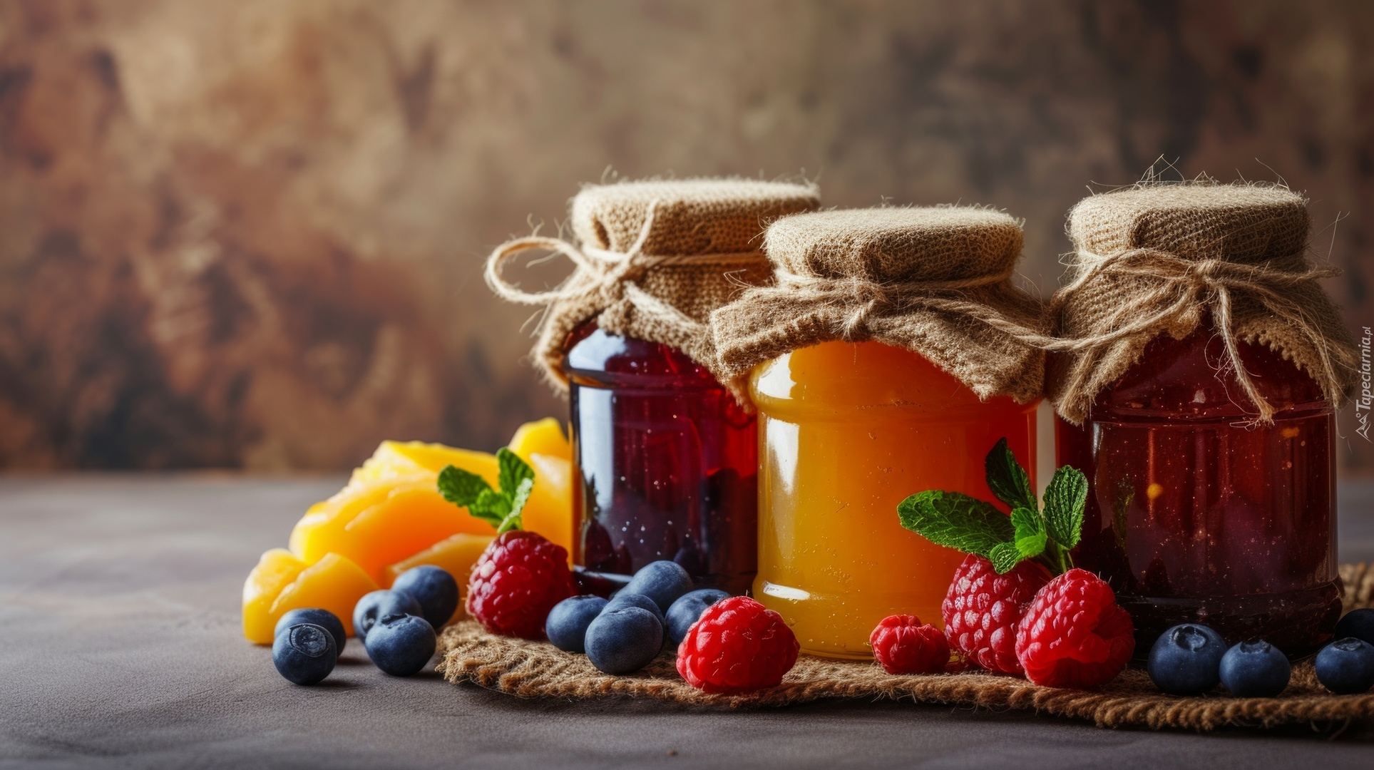 Edytor tapety: Trzy słoiki z dżemem i owoce obok