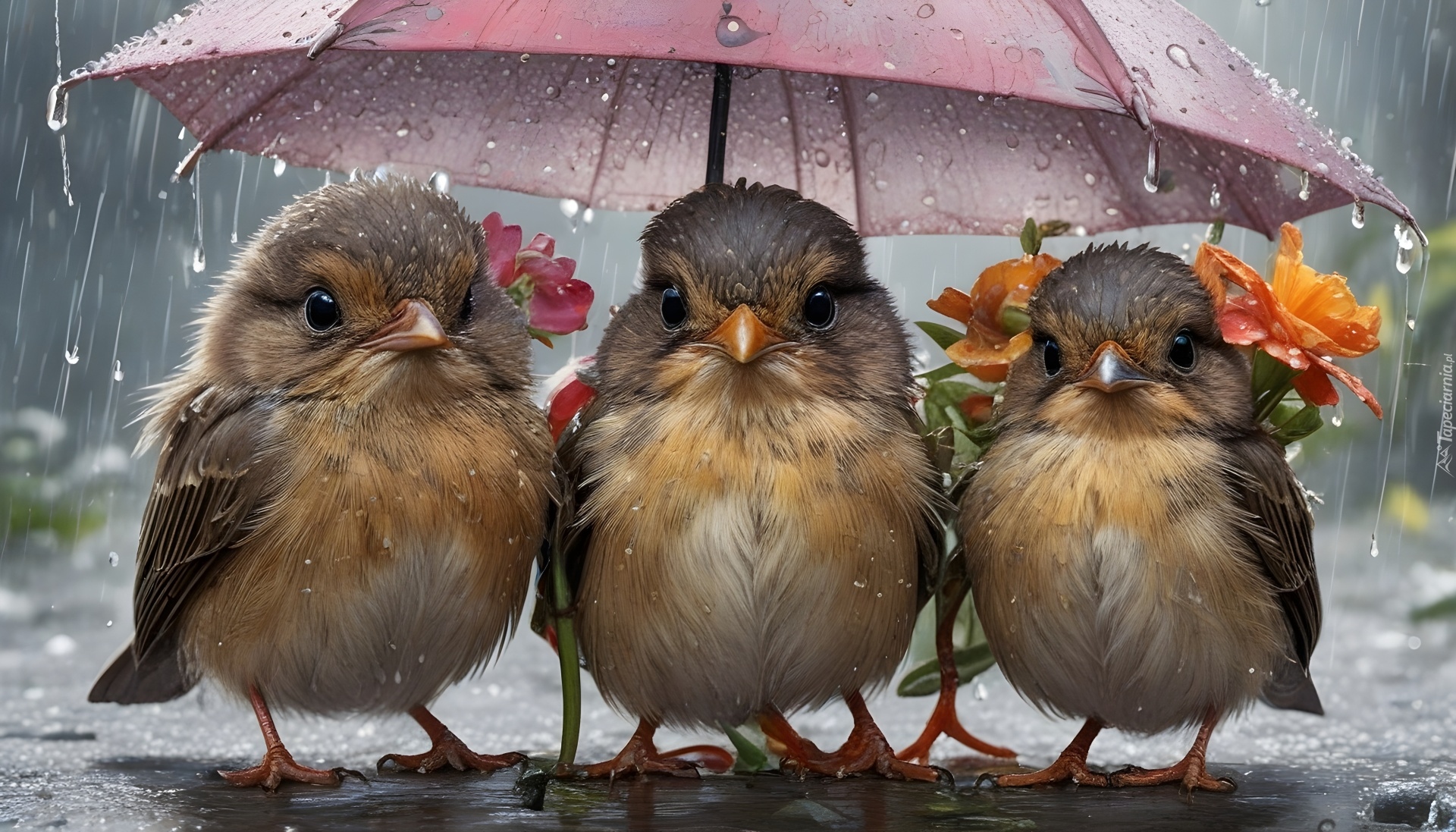 Edytor tapety: Trzy małe ptaszki pod parasolem w padającym deszczu