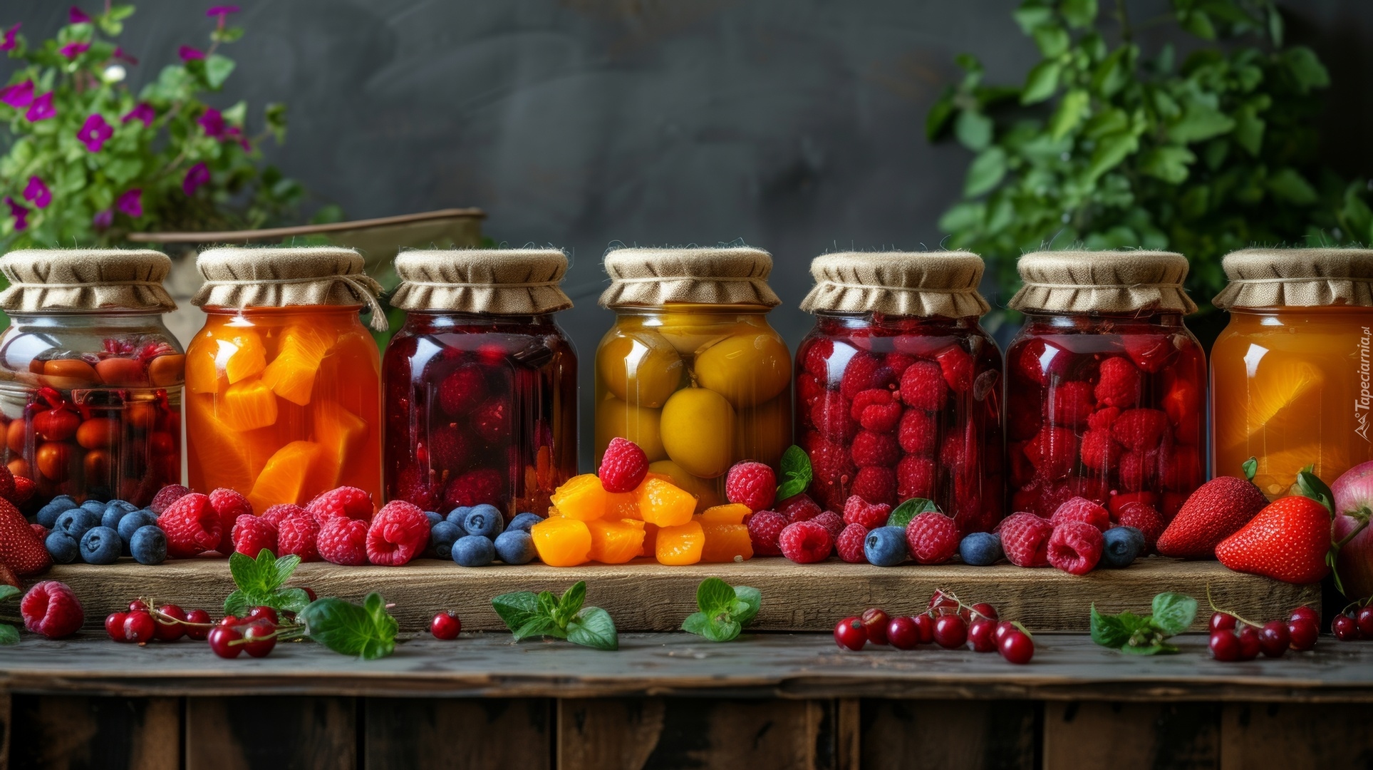 Edytor tapety: Kompoty w słoikach i owoce na deskach