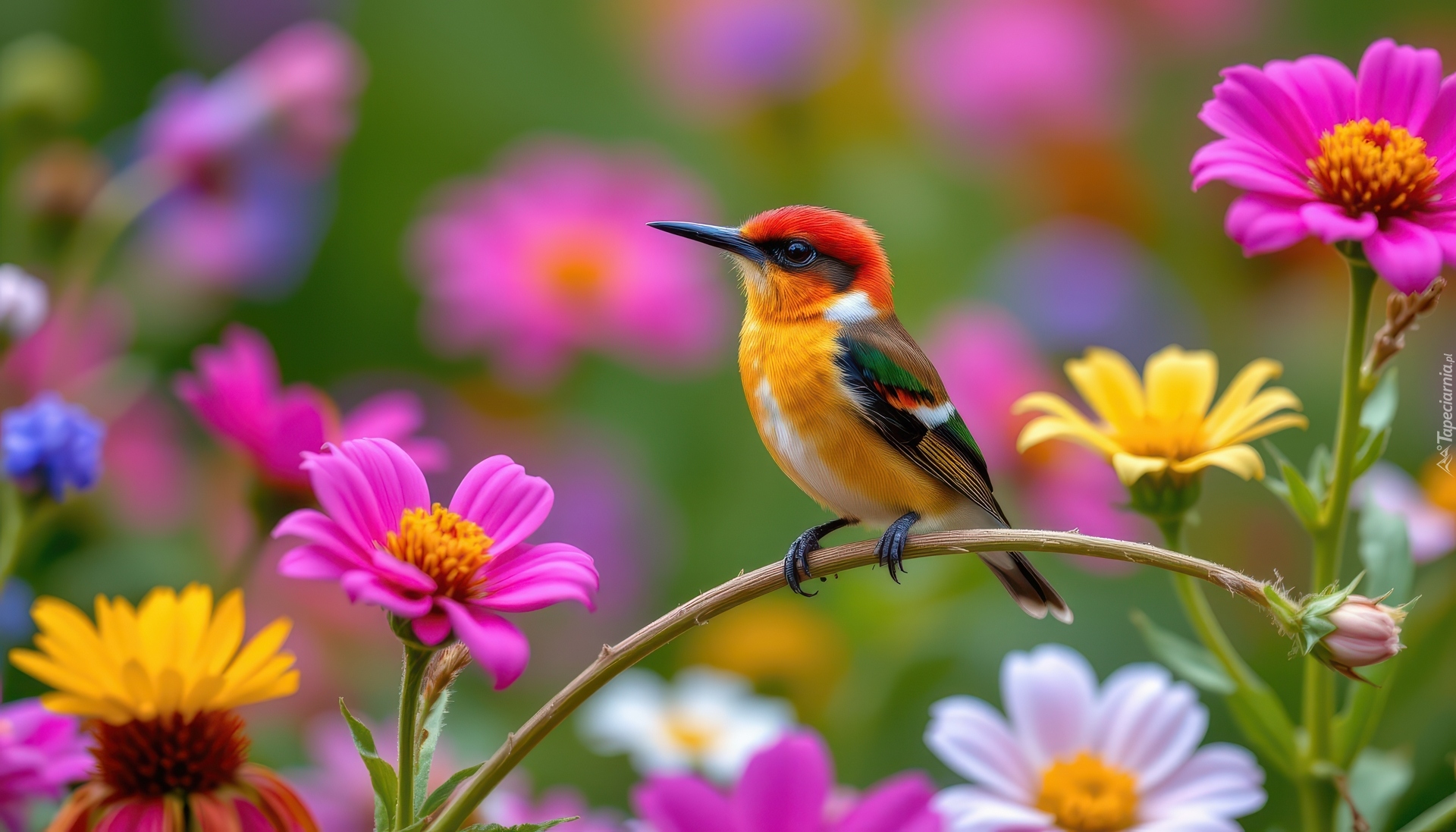 Edytor tapety: Ptak na łodydze obok kolorowych kwiatów